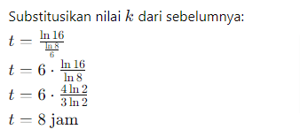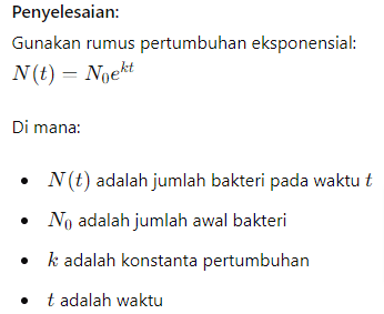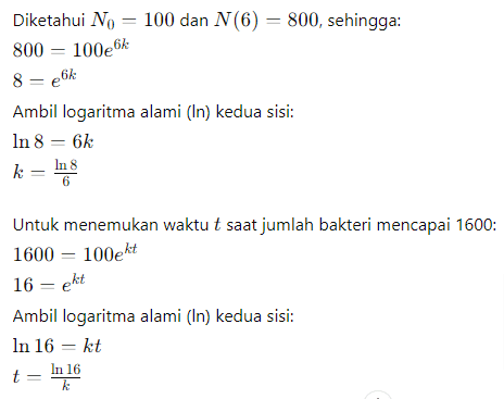 Contoh Soal: Suatu populasi bakteri bertambah secara eksponensial. Jika jumlah awal bakteri adalah 100 dan jumlahnya menjadi 800 dalam waktu 6 jam, berapa waktu yang dibutuhkan untuk mencapai 1600 bakteri?