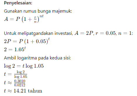 Contoh Soal: Berapa lama waktu yang dibutuhkan untuk melipatgandakan investasi dengan tingkat bunga tahunan sebesar 5%?